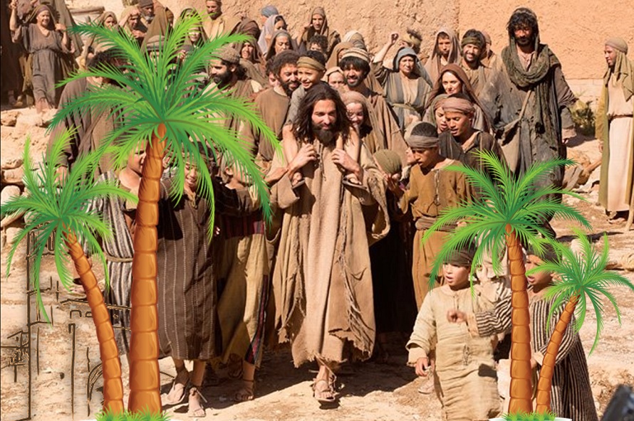 o Jesús entra en Jerusalén en un humilde burro, rodeado de gente sencilla.