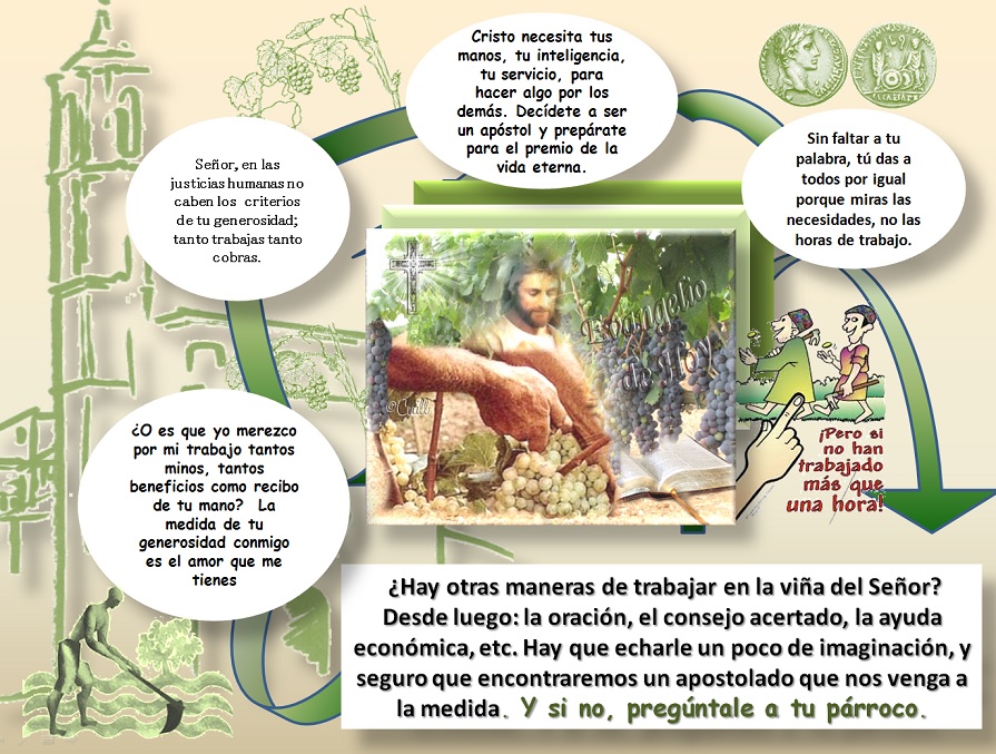 En aquel tiempo, dijo Jesús a sus discípulos esta parábola: «El Reino de los Cielos se parece a un propietario que al amanecer salió a contratar jornaleros para su viña. Después de ajustarse con ellos en un denario por jornada, los mandó a la viña. Salió otra vez a media mañana, vio a otros que estaban en la plaza sin trabajo, y les dijo: «Id también vosotros a mi viña, y os pagaré lo debido.» Ellos fueron. Salió de nuevo hacia mediodía y a media tarde e hizo lo mismo. Salió al caer la tarde y encontró a otros, parados, y les dijo: «¿Cómo es que estáis aquí el día entero sin trabajar?» Le respondieron: «Nadie nos ha contratado.» Él les dijo: «Id también vosotros a mi viña.» Cuando oscureció, el dueño de la viña dijo al capataz: «Llama a los jornaleros y págales el jornal, empezando por los últimos y acabando por los primeros.» Vinieron los del atardecer y recibieron un denario cada uno. Cuando llegaron los primeros, pensaban que recibirían más, pero ellos también recibieron un denario cada uno. Entonces se pusieron a protestar contra el amo: «Estos últimos han trabajado sólo una hora, y los has tratado igual que a nosotros, que hemos aguantado el peso del día y el bochorno.» Él replicó a uno de ellos: «Amigo, no te hago ninguna injusticia. ¿No nos ajustamos en un denario? Toma lo tuyo y vete. Quiero darle a este último igual que a ti. ¿Es que no tengo libertad para hacer lo que quiera en mis asuntos? ¿O vas a tener tú envidia porque yo soy bueno?» Así, los últimos serán los primeros y los primeros los últimos.»